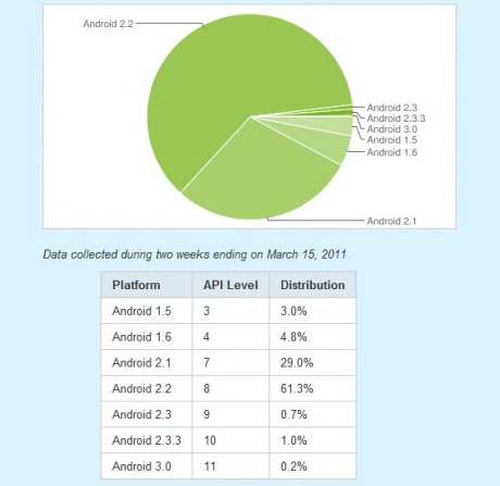 Този път отне малко повече време на Google да публикува процентното разпределение на различните версии на Android. Въпреки излизането на Android 2.3.3 Gingerbread и 3.0 Honeycomb, Android 2.2 Froyo все още е най-използваната версия – над 60% от Android устройствата я използват. По-точно, 61.3% от Android устройствата използват Android 2.2 Froyo. Изглежда, че още известно време това ще бъде най-разпространената версия на Android.