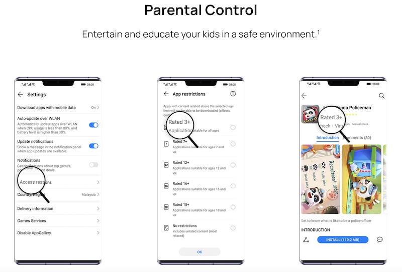 AppGallery разгръща най-високо ниво на верификация, за да се защити чувствителна информация и поверителност на потребителите. Осигурява се пълен контрол на потребителя над личната му информация, например като биометрични данни. EMUI дава на потребителите възможността да контролират използването на приложенията. По-важното е, че цялата база данни ще бъде съхранявана локално, според региона на регистрация на всеки потребител.