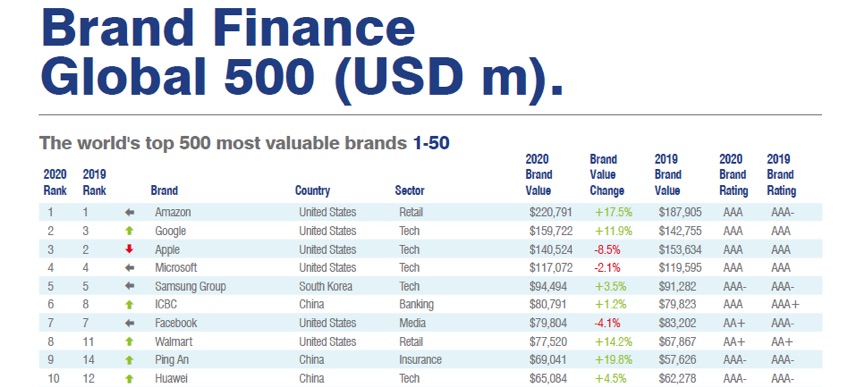 Brand Finance, водеща компания за оценка и стратегически консултации за брандове, със седалище в Обединеното кралство, посочи за първи път Huawei като една от първите 10 най-скъпи марки в света. В наскоро публикувания доклад Brand Finance Global 500 2020, Huawei е третата китайска компания в списъка с обща стойност на марката от 65.084 милиарда щатски долара, което е 4,5 процента увеличение спрямо предходната година.
