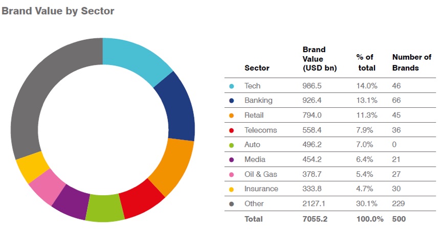Технологичният сектор продължава да се позиционира като най-ценна бизнес сфера. 46, или 14% от 500-те най-скъпи марки, произхождат от технологичния сектор. Заедно те имат комбинирана стойност на марките от 986,5 милиарда долара. Huawei е единствената китайска технологична марка сред топ 10 на най-скъпите марки.