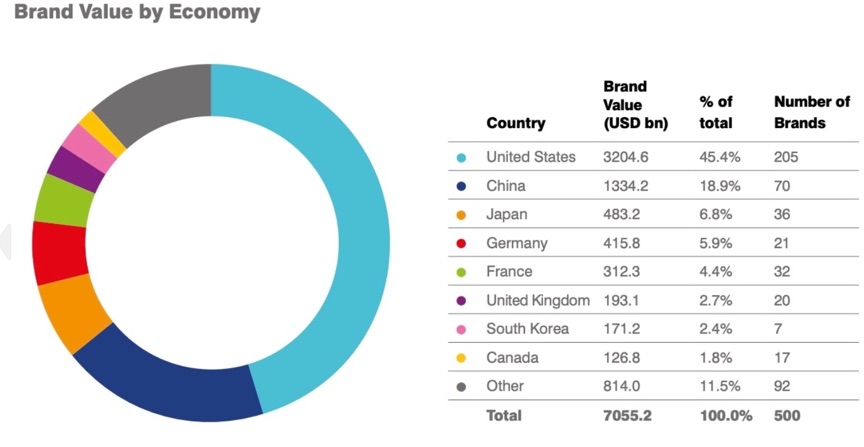С 205 компании, които представляват 45,4 на сто от фигуриращите в топ 500, САЩ са най-силно застъпената икономика в класацията с комбинирана стойност на марките от 320,4 милиарда долара. Китай следва плътно в класацията със 70 компании, което се равнява на 18,9 на сто и комбинирана стойност на марките от 133,4 милиарда долара.