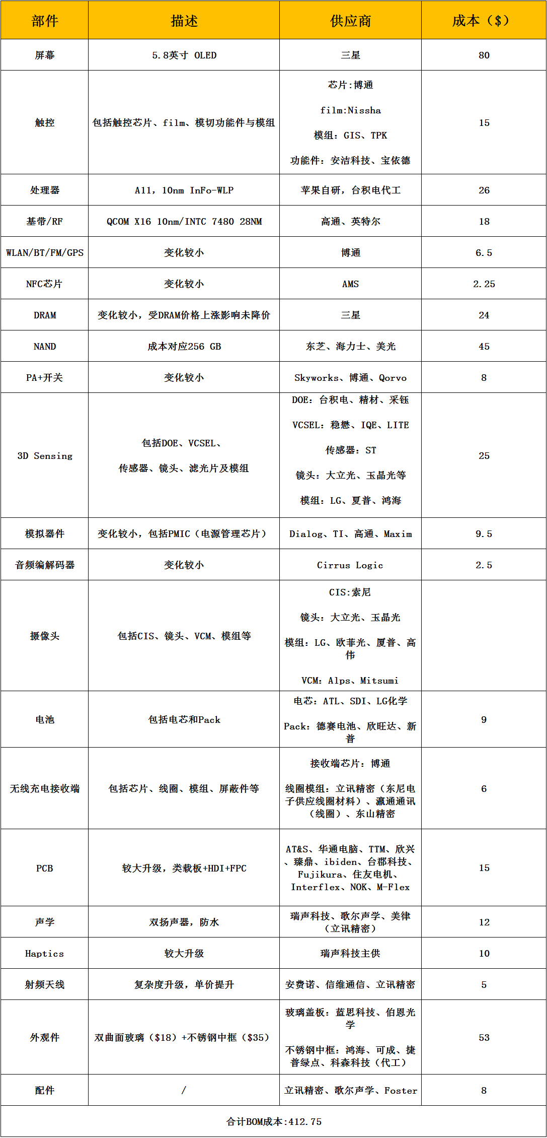 Apple A11 Bionic чипсетът, струва 26 долара. Модемът е от Qualcomm и струва 18 долара. 3D Face ID сензорът е 25 долара, а предният стъклен панел – 18 долара. Вградената памет (256GB) е от Toshiba и струва 64 долара, 3GB RAM – 24 долара и списъкът продължава в този дух.