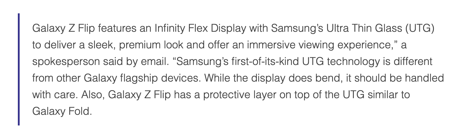 “Galaxy Z Flip разполага с Infinity Flex дисплей с ултра-тънко стъкло (UTG) на Samsung, за да осигури елегантен, премиум вид и да предложи впечатляващо изживяване. Първата по рода си UTG технология на Samsung е различна от тази в другите Galaxy устройства. Докато дисплеят се огъва, с него трябва да се работи внимателно. Освен това, Galaxy Z Flip има и допълнителен защитен слой върху UTG, подобен на този в Galaxy Fold.”