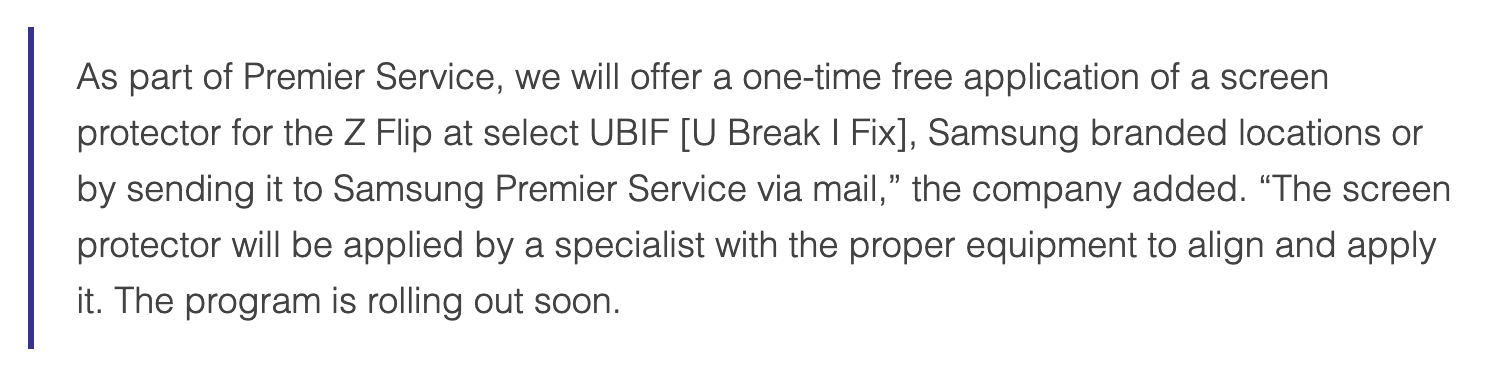 Отправили са запитване към Samsung, дали собствениците на Galaxy Z Flip могат да се възползват от безплатна замяна на дисплей, както тези на Galaxy Fold. Отговорът на компанията е, че “закупилите Galaxy Z Flip могат да получат еднократна замяна на дисплея за 119 долара, а като част от Premier Service могат да предложат еднократно протектор за екран при избрани UBIF (U Break I Fix).