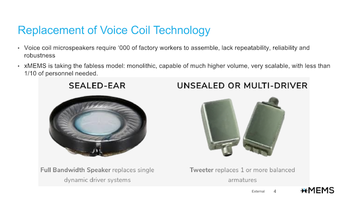 xMEMS е стартъп компания, основана през 2017 година, със седалище в Санта Клара, Калифорния и с клон в Тайван. До сега, xMEMS са работи в “стелт режим”, без да са пускали нито един продукт на пазара. Твърди се, че сега, xMEMS са прескочили бариерите на съществуващата от десетилетия технология и са преоткрили звук с иновативни решения от чист силиций.
